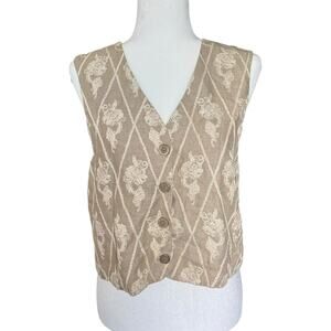 Vintage Express Embroidered Vest M Linen Blend Beige Diamond Floral USA