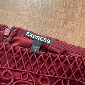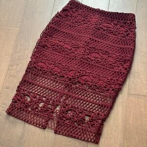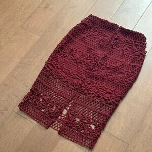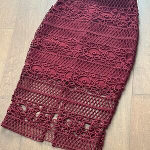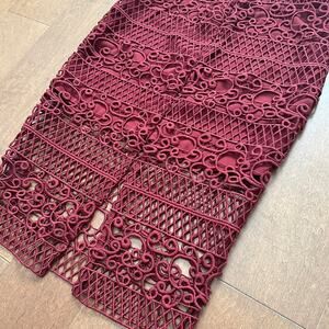Burgundy and red floral lace pencil skirt with a zipper on the back. This is such a beautiful thick lace skirt with a slit in the back.