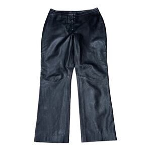 Vintage Express Leather Straight Leg Pants in a size 7/8. Has a front zipper and concealed snap closure. Seams at the knees. Back has a yoked waist and back darts. Fully lined. Measures approx. 15” flat lay waist, 10” rise, and 27” inseam. 100% genuine leather. Lining is 100% polyester. In great condition.
