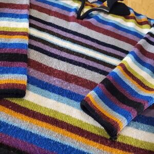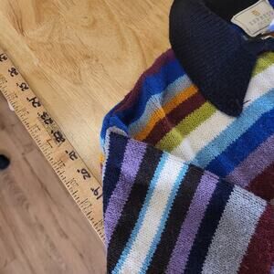 Add a vintage touch to your wardrobe with this Express tricot knit sweater. The multicolored striped pattern and collared neckline give it a classic look, while the 1/4 zip and long sleeves provide modern comfort. This sweater is perfect for any occasion, whether you're dressing up or dressing down. It comes in a size small and is made of high-quality knit fabric, ensuring both durability and comfort. Don't miss out on this unique piece for your collection.