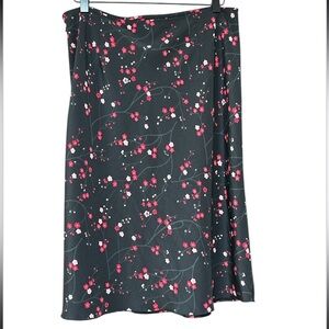 Express Women's A-Line Midi Skirt featuring a black background with a floral pattern of pink and white cherry blossoms. This skirt is identified as a Y2K fairycore whimsigoth style. Midi skirts, like this one, typically fall below the knee and can be very flattering for most body types. The A-line shape of the skirt gently flares out from the waist, creating a flattering silhouette that can help to conceal the stomach, hips, and thighs.