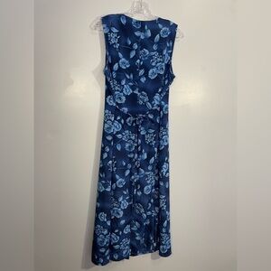 Beautiful vintage floral dress in shades of blue. Made by Expressions. Unlined. Maxi length Sleeveless. Tie back at waist. Full button down front. Made of 100% polyester. Size 16W. Machine washable. Just perfection!