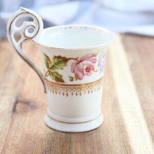 Rose pattern with gold trim and notation on bottom of the cup