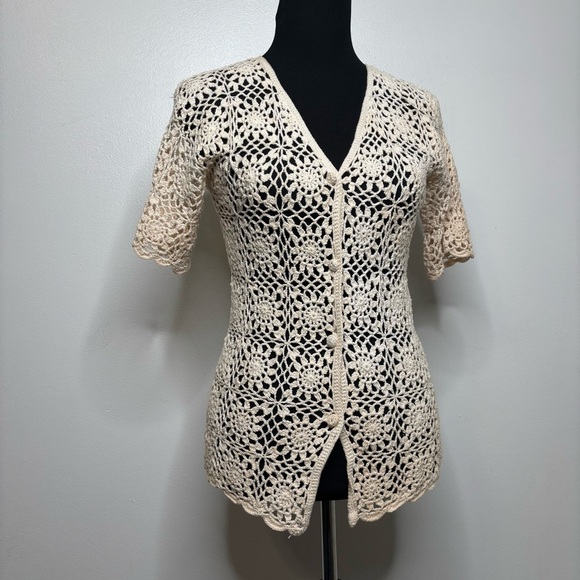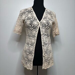 Vintage F.A.I. Crochet Cardigan Women’s L 100% Cotton Open Knit Boho Cream