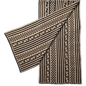 Level up your winter wardrobe with this stylish this reversible vintage FENDI Black & Tan Multi Print Scarf Stripe/Check/Monogram.