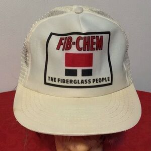 Vintage! Rare!! ~ 1980s? 90s? FIB-CHEM Fiberglass From western PA with Mesh Baseball Cap White in color Trucker Hat SnapBack w/ adjustable strap Adult one-size-fits-most Condition: Hat has some normal wear including stains & fading, but no major blemishes, stains, or tears(pictured). Refer to pictures for more condition detail.