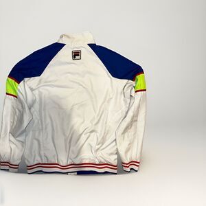 Crafted for the tennis enthusiast, this FILA Men's Track Jacket in size XL embodies a blend of style and functionality. The colorblock design in a crisp white with neon green accents is both eye-catching and reminiscent of vintage sportswear aesthetics, perfect for those who appreciate a retro vibe. Featuring a full zip closure, long sleeves, and crafted from breathable mesh polyester material, it offers comfort during the most intense matches or casual outings.