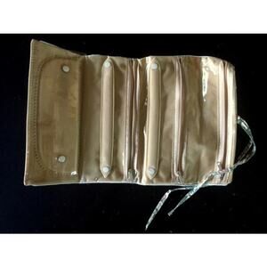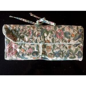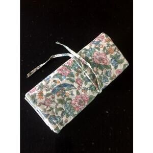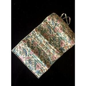 Super pretty, vintage 70's off-white travel bag. Pink, blue, orange, and green floral and bird print. Quilted with light blue stitching. Inside is made of a tan velour and clear vinyl. Three zipper compartments. Two holders for rings or bracelets. One snap pocket at the bottom with a removable small cushion. (I believe that might be for glasses?) Two ties to wrap it up.