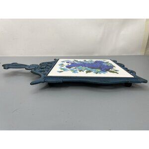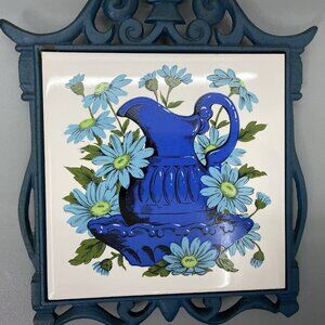 Vintage FM Trivet Cast Metal Ceramic Tile Hot Plate Floral Blue Made in Japan