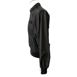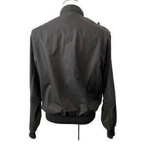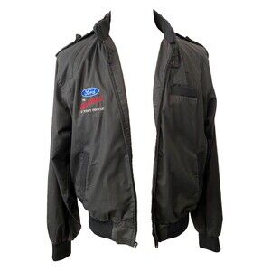 Vintage Ford jacket made by Apollo in Hong Kong. Black motorcycle style jacket with zip front closure (zipper is missing the pull tab), two waist pockets and one chest pocket. Stretch knit sleeve and waist hems. Snap strap at the neck. Lightweight fabric with lined interior is great for spring and fall, or mild cool weather environments.