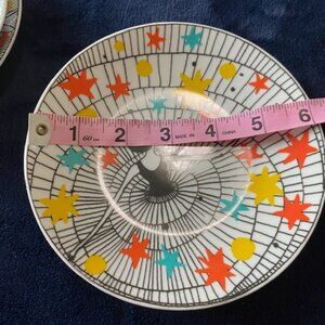 FRAGONARD PARFUMEUR FRANCE Mid Century Modern Snack/ Dessert Plates Featuring Twirling (Ballet?) Dancers Set of 4. Each of these pieces is in excellent pre-owned condition and have no chips, cracks, crazing, or image loss. Measure 6 inches in diameter are so colorful and interesting with each one featuring a different dancer wearing her own unique costume and hairstyle.
