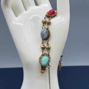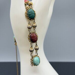 Vintage FREIRICH Gold Tone Filigree Scarab Bracelet Glass Stones w/ Safety Chain