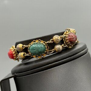 This exquisite vintage Freirich bracelet features a stunning gold-tone filigree design adorned with glass scarab stones. Complete with a safety chain, it's a timeless piece for any jewelry collection. Perfect for those who appreciate vintage elegance and unique craftsmanship.