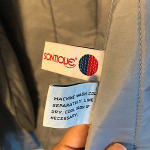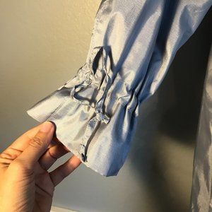This is a fantastic one of kind piece. It is lined, button-down, and ruched in the neck and wrist area. The shell is 100% polyester and the lining is 100% nylon. You won't see anyone else walking around with something as gorgeous as this.