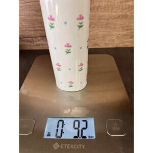This vintage FTD porcelain bud vase from Japan features a charming design of flowers and hearts on a glossy white cylinder shape. Standing at 6.5 inches tall and weighing 10 oz. The vase is part of the FTD Especially For You! product line.