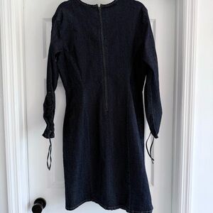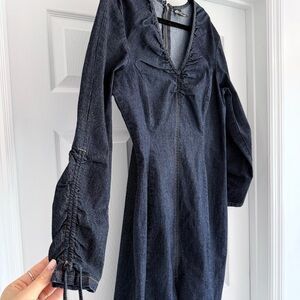 Rare Vintage FUBU dark wash denim dress in size 16W— a true Y2K streetwear statement piece. Features a flattering V-neckline with ruched detail, long sleeves with adjustable drawstring ruching, and a structured denim fit that shapes and flatters while still being comfortable.