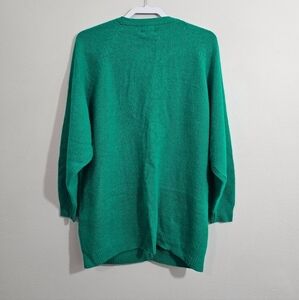 Pre-owned vintage Fabe cardigan, size medium. It's made of a lambswool/angora rabbit hair/nylon blend fabric that's fairly lightweight with a little stretch, has 2 waist pockets, buttons down in the front, and it comes in solid green. It's in excellent condition, no stains, rips, etc.