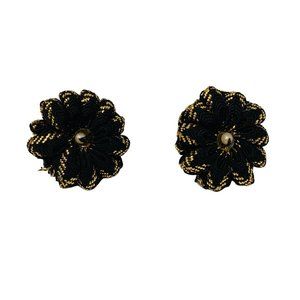 Vintage Fabric Floral Black Gold Screw Back Earrings