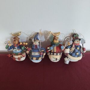 Vintage Fabric Mache Holiday Winter Christmas Ornaments Snowmen & Moose Set of 4