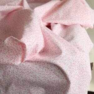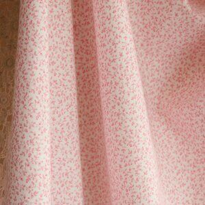Charming piece of vintage fabric in a pink and white floral vine print. Calico -esque. This is a single piece that measures just about 4" square. The length edges are not cut entirely straight, so may vary an inch or so give or take. This looks and feels like a cotton to me.