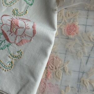 • Hand-embroidered floral pillow case (roses in pink/green on white ground).-- selling the embroidery for sewing/not for use as a case
