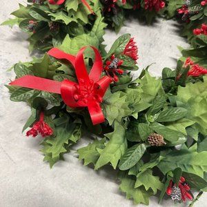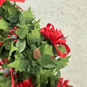 Vintage Fabric and Plastic Christmas Holly Wreath with Bows, Pinecones