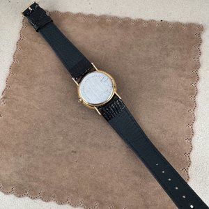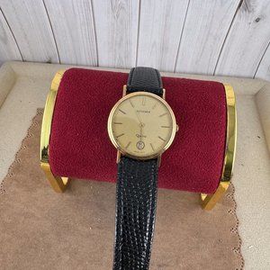 Vintage Fabulous Bucherer Swiss Made Watch with date, the case is 1 3/16 inches in diameter with Quartz Movement. Man's Watch Gold hands and raised markers, Late 20th century , Mineral Crystal has a small very, very small scuff at 5, Thin 5.6MM case thickness 18K 10 Micron Gold Plated with New 9 inch Black embossed Leather Strap Solid Stainless Steel back 10 Micron Gold Plated Water Resistant to 3ATM marked 2060CDDP new battery serviced