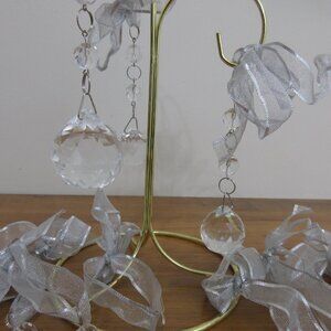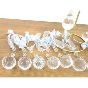 Previously they were hung on a white and silver Christmas tree. Each of the large and medium balls are attached to two .50" balls with silver colored jump rings and tied with a 3/4" silver mesh ribbon. There are no chips or defects on the glass balls. The ribbon could use a light press!