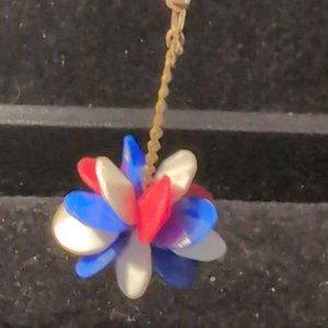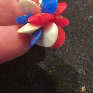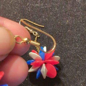 Estate clean out. Dangling from a gold tone chain and pierced ear wire are these faceted red, white and blue beads to create a bundle. The beads are plastic. Great retro appearance.