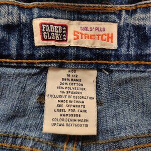 Step into a nostalgic style with these Vintage Faded Glory Girls' Plus Jeans. Featuring a trendy flare leg, negative stencil silver glitter retro designs and camo patches, these jeans bring a fun and unique twist to classic denim. The blue denim captures the essence of Y2K fashion, offering a retro look that's both stylish and playful. Designed for a comfortable fit, these jeans are perfect for everyday wear, blending durability with a touch of whimsy. Add a vintage flair to your wardrobe with these standout jeans from Faded Glory.