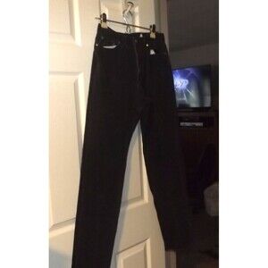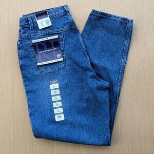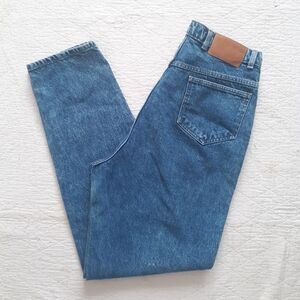 Vintage high-waisted denim jeans offer a classic mom jean silhouette with a tapered leg and a flattering high rise. Crafted from durable 100% cotton denim in a medium wash, these USA-made pants feature a five-pocket design, sturdy belt loops, and a branded button closure. The rigid denim provides a structured fit that softens over time, making them a timeless staple for any wardrobe.