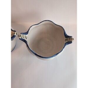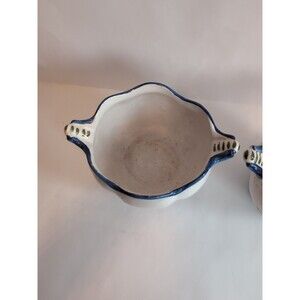 These beautiful pots measure approx 7" from handle to handle, approx. 4 1/2" high, and 4 3/4 wide. They are in excellent condition for age, with minor wear and very minor nicks on the inside rim which do not show up in photos well but they can be felt. Nonsmoking home.
