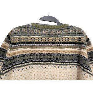 A classic vintage Fair Isle cardigan with timeless Nordic patterning, made from 100% lambswool for natural warmth and breathability. Crafted in Hong Kong during the era known for high-quality knitwear, this sweater features earthy cream, olive, and charcoal tones in traditional banded motifs. The relaxed Large fit layers effortlessly and works just as well worn buttoned or open — an easy, cozy staple for fall and winter.