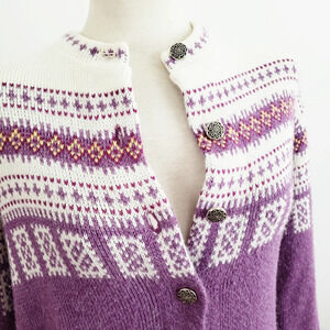 Purple and white cardigan by Jersild. Made from orlon acrylic.