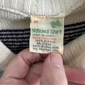 Vintage sweater in size medium. A Fair Isle like pattern in a red, white and blue color combo. The stitching on the back neck is loose, but not a hole (photo shown).