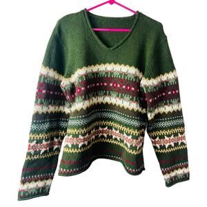 Item: Vintage Fair Isle Knit SweaterColor: Green with multicolor Fair Isle patternStyle: Classic pullover sweaterSleeve: Long sleevesPattern: Fair Isle knitMaterial: Acrylic or wool blendNeckline: V-neckFeatures: Cozy and warm, intricate Fair Isle pattern, relaxed fit, perfect for layering, timeless vintage charm