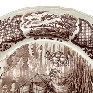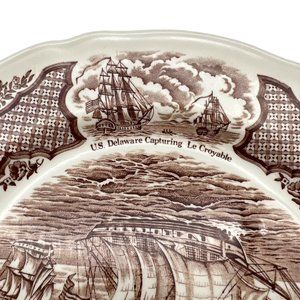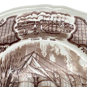 Vintage dinner plate in the Fair Winds pattern from Alfred Meakin featuring historical scenes of Chinese export to America. Imagines include Friendship of Salem, New York Harbor 1830, US Delaware Capturing Le Croyable, and Canton Port 1830. The plate is 10 1/2" across. Made in Staffordshire, England.