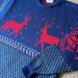 Vintage Fairisle Reindeer Navy Red Printed Crewneck Winter Sweater