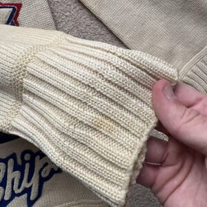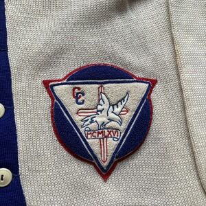 Notes: classic display-worthy team letterman cardigan with distinctive patches and contrast trim.