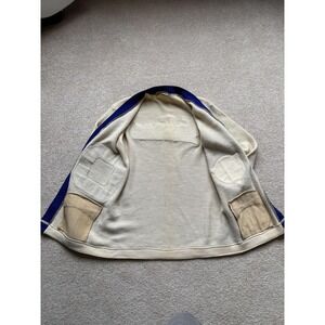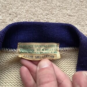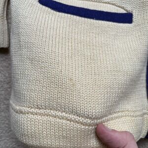 Vintage varsity cardigan sweater in cream with blue trim and button front.