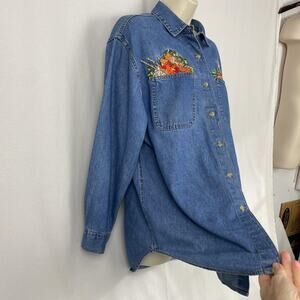Classic denim shirt with embroidered farmhouse style scene with pumpkins, cornstalks, scarecrow, wheelbarrow. Great for fall!