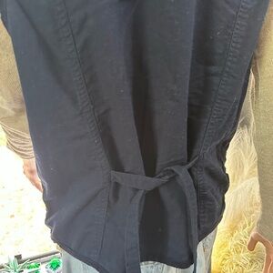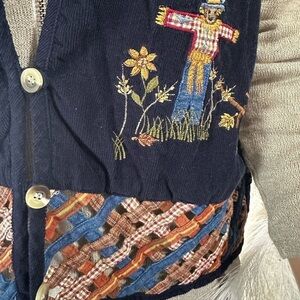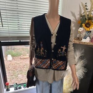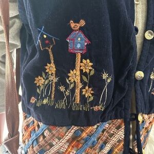 Fall themed vest ft. embroidery details. Different fall colored/ themed fabrics accenting the bottom with a weave style. Strings in back for pullback and/or extra style.