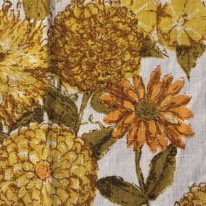 This vintage linen tea towel showcases a retro floral design in yellow tones, perfect for adding charm to a kitchen or display area.