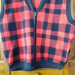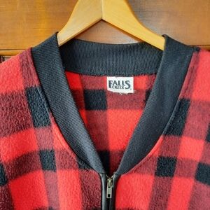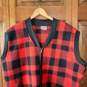 Vintage Falls Creek red and black buffalo check plaid fleece full zip vest. Round neckline with full metal zipper front closure, all-over buffalo check pattern, 2 large hip pockets, and ribbed collar, arm openings, and waistband. In great condition! No material tag. Unisex. No size tag, fits like a XL. See measurements below.
