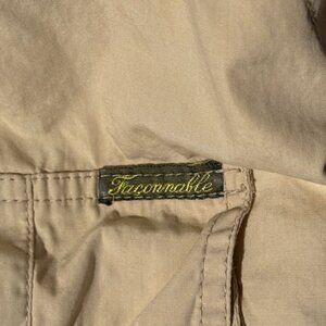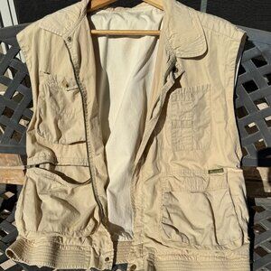 Rare vintage Façonnable safari-style utility vest in tan cotton, featuring multiple cargo pockets, a zip front, and an elasticized waistband. Classic French Riviera outdoor/travel aesthetic. Perfect for safari/military styling, gorpcore, or vintage menswear fans.