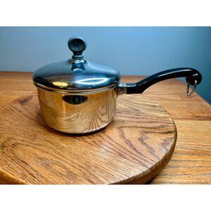 This vintage Farberware saucepan from Bronx, NY, USA, features a 1-quart capacity and comes with its original lid. Made from aluminum-clad stainless steel, it’s durable for everyday cooking and a perfect addition to any kitchen collection.