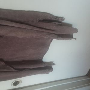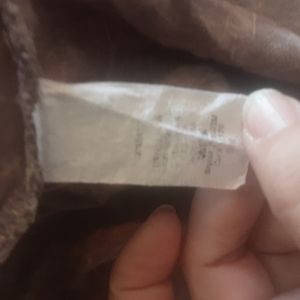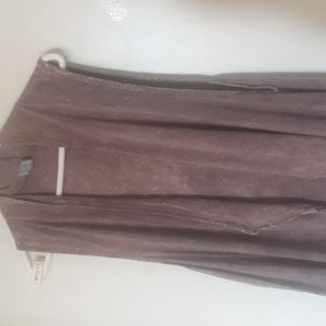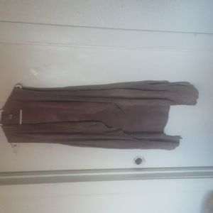 Brown kind of tie Dye, sleeveless, duster length, Pocketed at sides, no holes or stains, loose threads noted, size S measurements are roughly 39" from shoulder to hem and about 20" pit to pit, possibly Rayon, material tag is illegible really, waterfall open style, pet friendly non smoking home vintage brand is J & M