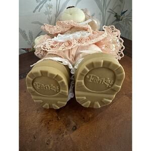 This vintage Farrell Furskins bear is a charming addition to any collection. The plush bear stands at 7 inches tall and features a Victorian hat, lace dress, and boots. The brown bear's brown eyes add to its authenticity, and it is an original piece from 1986.