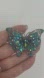 0579A- women’s vintage, retro butterfly, brooch, Crystal, rhinestones, iridescent, highlights, tones of aqua blue, teal, navy blue, with yellow highlights, blue green, Silver-tone, filagree, roll tab, Silver-tone closure, 2 inches wide, 1.5 inches tall, .5 inches deep. Swirly designs on the back wings, lovingly, preowned. Excellent condition.