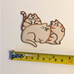 Sweet little vintage trio of three fat orange, white, and brown tabby cats iron-on applique. Would be great for a denim jacket or any piece of clothing that needs more cats (which is all clothing, really)!